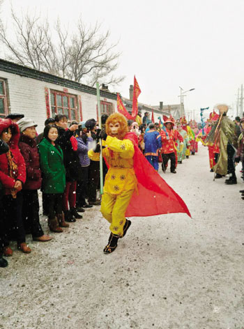 2月12日,農(nóng)歷正月初五,五寨縣前所鄉(xiāng)南坪村正在進(jìn)行的八大角秧歌表演,村民們冒著風(fēng)雪駐足觀看。圖為一村民扮演的美猴王。(許凈 攝)