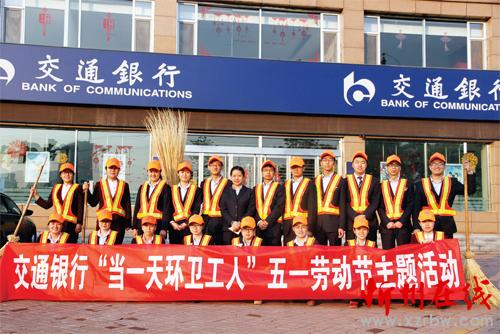為表達對辛勤工作的勞動者——城市環(huán)衛(wèi)工人的尊重和敬意,在五一國際勞動節(jié)到來之際,交通銀行忻州分行營業(yè)部舉行了“ 當(dāng)一天環(huán)衛(wèi)工人”主題活動。圖為活動結(jié)束后的合影。(鄭玉蘭 攝)