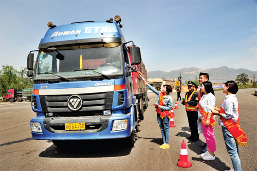 5月13日上午,代縣公路管理段組織路政執(zhí)法人員和共青團(tuán)員,深入到陽(yáng)明堡鎮(zhèn)治超點(diǎn)和四岔路口開展以“依法治路保障暢通,愛護(hù)橋梁保障安全”為主題的路政宣傳月活動(dòng)。(石俊文 攝)