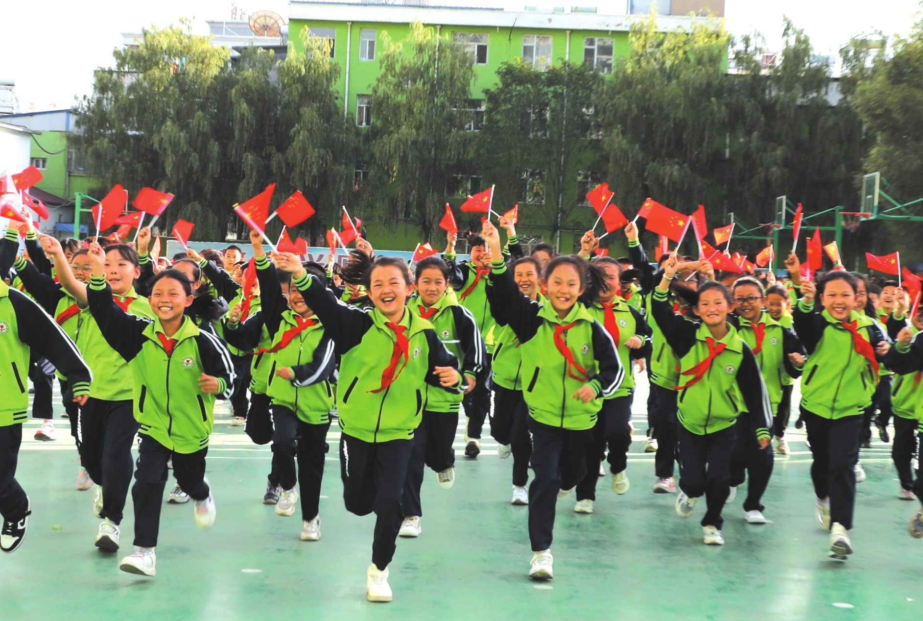 原平市第一小學(xué)的小學(xué)生揮舞著國(guó)旗,喜迎國(guó)慶。褚震攝