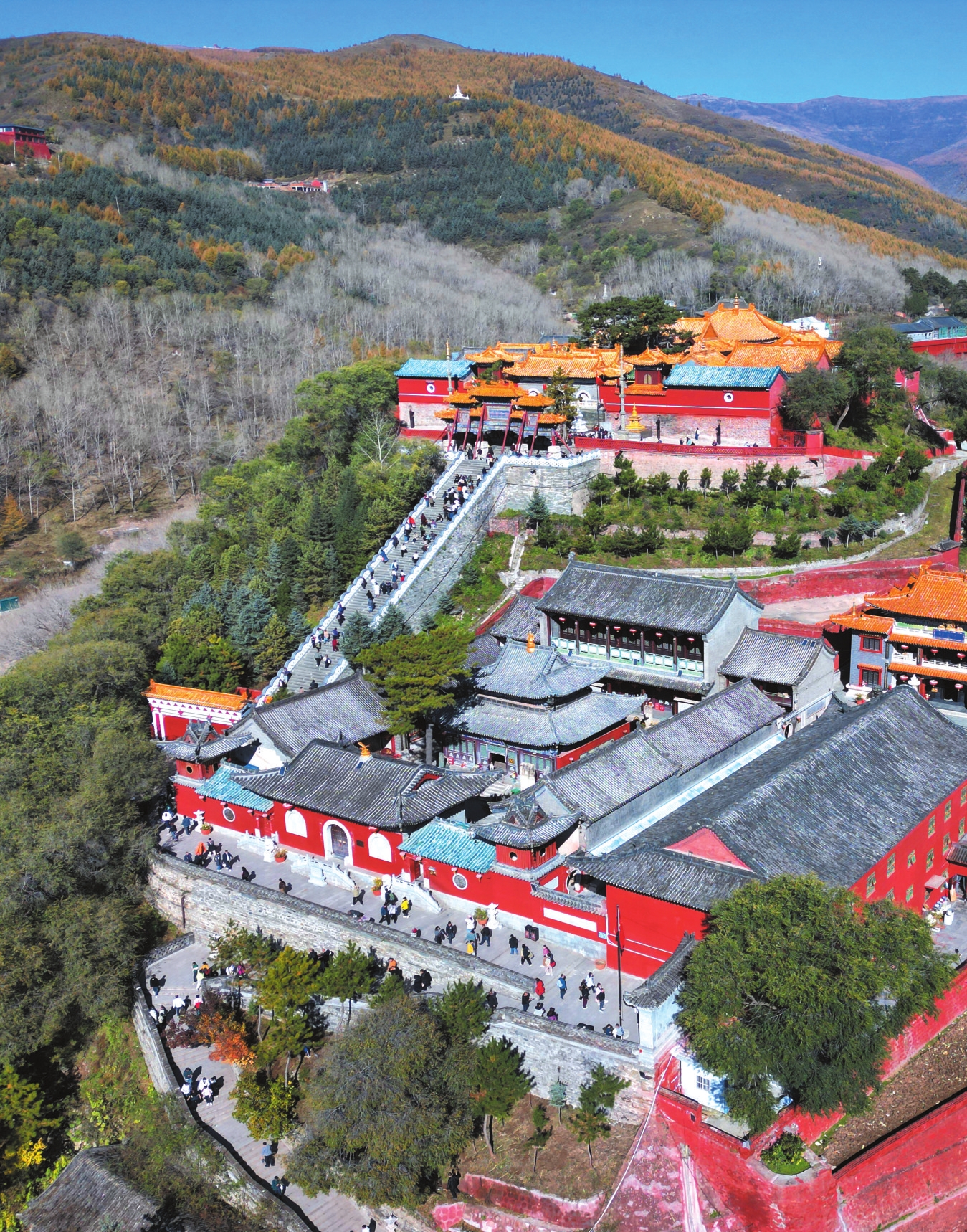 秋季已近尾聲,五臺山的秋色卻進入最絢爛的篇章。漫山松柏與闊葉林褪去翠綠,換上金色、赤紅與橙黃的華服,與千年古剎的紅墻黛瓦相映成景,吸引海內外游客共赴這場秋日禪意之約。