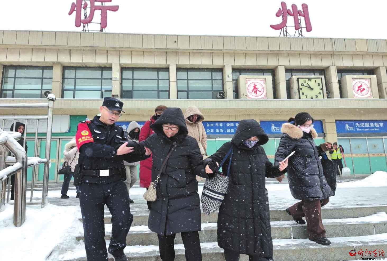 2月9日,忻州突降大雪,忻州站派出所干部民警全員堅守崗位,在站前廣場、進站口等重點區(qū)域巡邏防控值守執(zhí)勤。民警主動攙扶旅客、提醒注意防滑,及時幫扶行李較多的乘客,排查整治安全隱患,用實際行動踐行“人民公安為人民”的承諾,確保春運期間旅客出行平安。(于新梅攝)