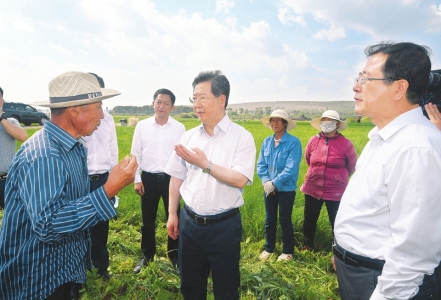 七月十三日,在右玉縣威遠鎮(zhèn)小香蔥種植基地,省委書記樓陽生向農戶了解產業(yè)帶動增收情況。山西日報記者李聯(lián)軍攝
