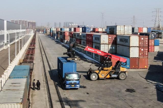 工作人員在沈陽東站東貨場向中歐班列上裝運(yùn)集裝箱。新華社記者 潘昱龍 攝