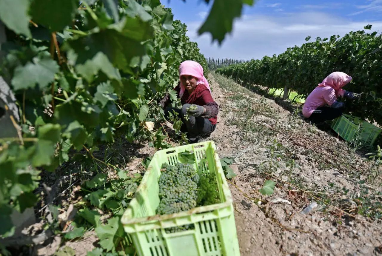 △寧夏銀川市永寧縣閩寧鎮(zhèn)原隆村立蘭釀酒葡萄種植基地,農(nóng)戶(hù)在田間采摘葡萄。