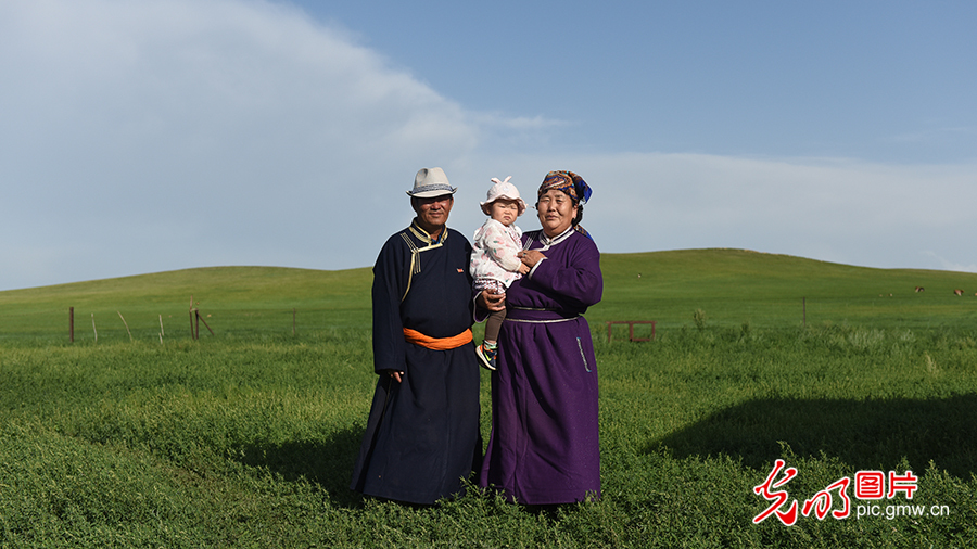 經(jīng)過60年的洗禮,當(dāng)年的上海孤兒已經(jīng)和這片草原完美的融為了一起?,F(xiàn)在的其日麥拉圖,家門口停著汽車,牛舍里裝著監(jiān)控,五畜齊全,人丁興旺,真正過上了好日子。圖為2020年8月2日,其日麥拉圖夫婦和小孫女在自家牧場。(潘迪攝/光明圖片)