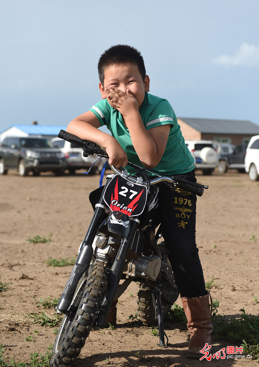 其日麥拉圖的大孫子時(shí)常會(huì)來爺爺家。對他而言,胯下的兒童玩具車就是他的“駿馬”,爺爺家的牧場就是他的后花園。圖為2020年8月2日,其日麥拉圖的孫子在牧場玩耍。(潘迪攝/光明圖片)