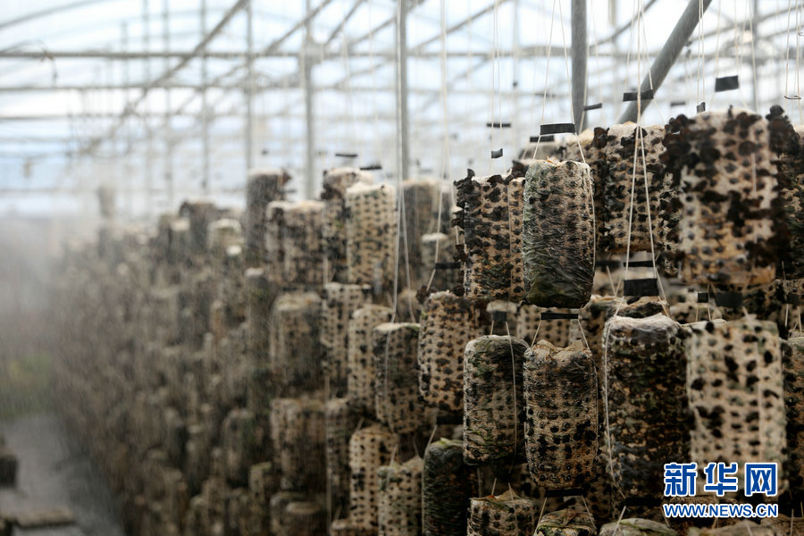 木耳菌袋每天要澆水10個多小時,張秀榮的大棚里安裝了自動噴灌設(shè)備。新華網(wǎng)曹楨攝