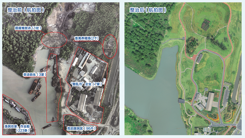 薛家洼生態(tài)園地處長(zhǎng)江東岸,占地986畝,曾經(jīng)生態(tài)環(huán)境問題非常突出,原有非法碼頭3家,散亂污企業(yè)7家,固廢堆場(chǎng)1處,規(guī)模化畜禽養(yǎng)殖場(chǎng)2個(gè),危舊民居96戶,??繚O民作業(yè)船、住家船223條?!扒缣煲簧砘遥晏煲簧砟唷?,這是曾經(jīng)薛家洼的真實(shí)寫照。
