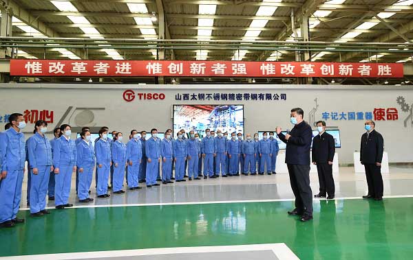 2020年5月11日至12日,中共中央總書記、國(guó)家主席、中央軍委主席習(xí)近平在山西考察。這是5月12日上午,習(xí)近平在太鋼不銹鋼精密帶鋼有限公司生產(chǎn)車間考察時(shí),同企業(yè)職工親切交流。 新華社記者 謝環(huán)馳攝