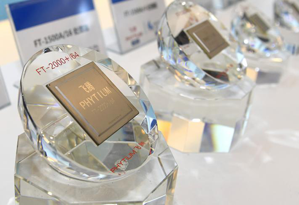 這是在天津?yàn)I?!嘘P(guān)村科技園協(xié)同創(chuàng)新展示中心展示的飛騰芯片(2019年1月17日攝)。新華社記者 岳月偉攝