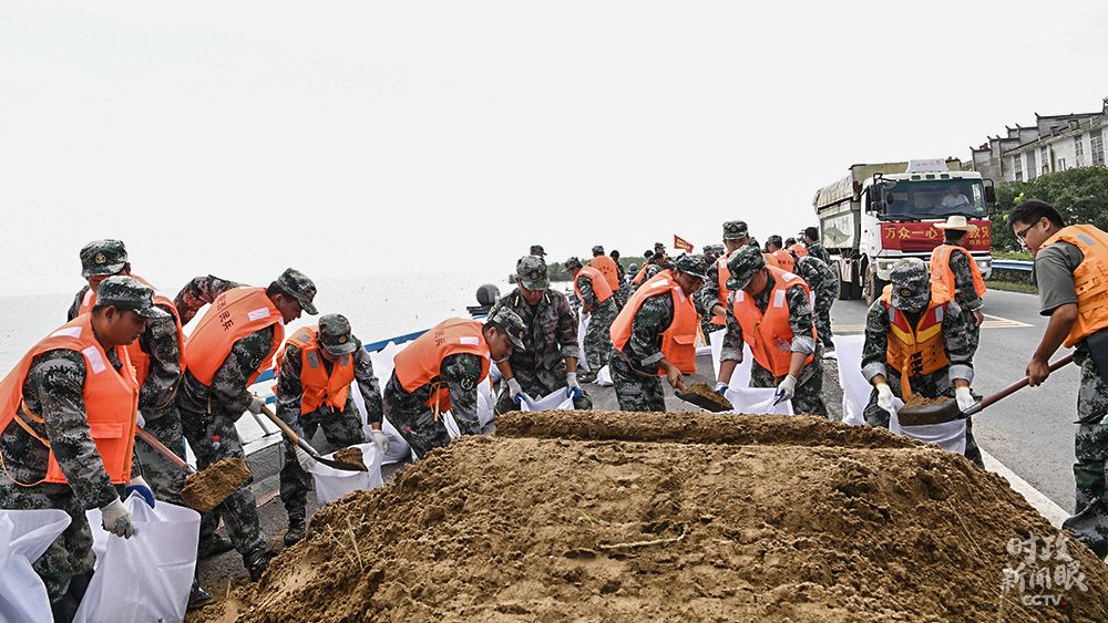 △7月25日,合肥環(huán)巢湖大道肥西段,官兵正在裝填沙袋加固堤壩。