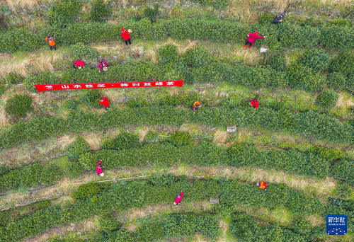 1月29日,湖北省秭歸縣郭家壩鎮(zhèn)王家?guī)X村茶農(nóng)在“絲綿茶1號(hào)”茶園采摘茶葉嫩芽(無人機(jī)照片)。(新華社發(fā) 王罡 攝)