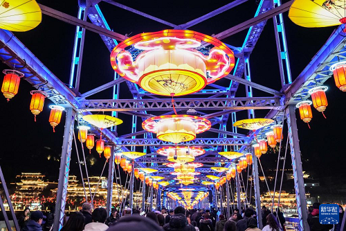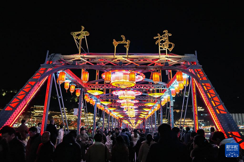 2月10日,甘肅省蘭州市在蘭州黃河鐵橋中山橋、東方紅廣場等城市地標及城區(qū)主干道布置的燈飾燈組正式接電亮燈,營造出喜慶祥和的新春佳節(jié)氛圍。