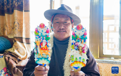 2月12日,在拉薩市林廓東路,來(lái)自西藏日喀則市仁布縣普松鄉(xiāng)的手工藝人羅布展示做好的酥油花。(新華社記者 丁增尼達(dá) 攝)