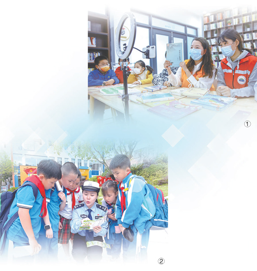 圖①:江蘇省如皋市如城街道聯(lián)合愛(ài)行動(dòng)實(shí)踐中心,走進(jìn)當(dāng)?shù)仡櫱f社區(qū)農(nóng)家書屋,通過(guò)“線上+線下”方式開(kāi)展“愛(ài)閱護(hù)苗”主題公益課堂活動(dòng)。圖為志愿者通過(guò)網(wǎng)絡(luò)平臺(tái)為學(xué)生推薦好書。