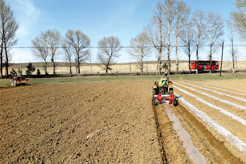 時下正值春耕春播時節(jié),我市各地的農(nóng)民忙著翻地、撒肥、鋪膜、犁土、播種,田野上拖拉機、播種機等農(nóng)機來回穿梭,一片繁忙景象。圖為4月21日五寨縣小河頭村村民正在鋪膜。(張志遠 攝)