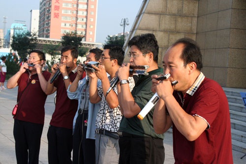 7月30日,原平市口琴協會演奏人員正在廣場上給觀眾演奏精彩的口琴技藝,深受群眾歡迎。該市注重文化建設,活躍群眾文化生活多姿多彩。(趙春曉 攝)