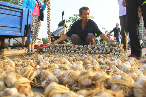 7月30日,原平市陽(yáng)房村蒜農(nóng)正在農(nóng)產(chǎn)品市場(chǎng)銷(xiāo)售紫皮蒜。原平紫皮蒜是當(dāng)?shù)氐钠放妻r(nóng)產(chǎn)品,盛產(chǎn)于滹沱河沿岸的新原鄉(xiāng)和西鎮(zhèn)鄉(xiāng),不僅是調(diào)味佳品,而且食用具有藥用價(jià)值,省內(nèi)外客商慕名而來(lái)購(gòu)買(mǎi),深受歡迎。(吉建平 攝)