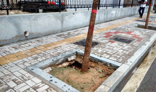 8月14日,記者在城區(qū)建設(shè)南路與長征西街交匯處往南不遠(yuǎn)處發(fā)現(xiàn),人行道一棵樹栽種區(qū)內(nèi)有一個破洞,并且有往左側(cè)延伸的趨勢,在雨水的沖擊下可能會對樹木和周圍道路造成影響,希望相關(guān)部門能夠重視,做到防患于未然。(許凈 攝)