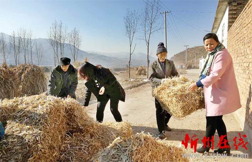 下鄉(xiāng)干部和村民一起搬草料