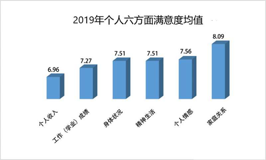 調(diào)查顯示,以10分為滿分,受訪者在2019年個(gè)人家庭關(guān)系方面打分均值為8.09分,滿意度最高,其次是個(gè)人情感方面,打分均值為7.56分,身體狀況和精神生活方面的打分均為7.51分。