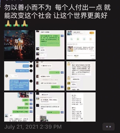 20日晚9點(diǎn)26分,她和兩個(gè)朋友創(chuàng)建了第一個(gè)微信群:鄭州求助信息匯總。不到半小時(shí),群里就涌進(jìn)了近400人,他們間多是陌生人,復(fù)制、粘貼各處看到的求助和救援信息,轉(zhuǎn)發(fā)到微博、微信群和朋友圈。群里的消息,就像當(dāng)晚的大雨一樣,幾十秒時(shí)間,就有三四十條。