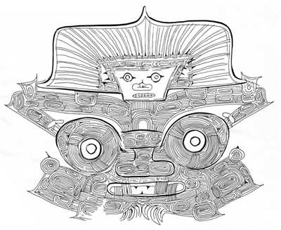 這是一幅良渚遺址中玉琮上的神徽考古繪圖:良渚遺址以其出土的大量精美玉器而聞名海內外。被世人熟知的“琮王”上刻有8組精致的神人獸面圖案——神人佩戴介字形冠帽,聳肩、平臂彎肘、五指平張位于獸面大眼斜上側,每組神像大小僅3厘米×4厘米。