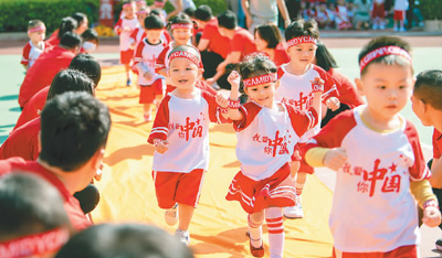 11月13日,在海南省??谑锌缡兰o(jì)成龍幼兒園秋季親子運(yùn)動(dòng)會(huì)上,家長(zhǎng)和孩子們一起體驗(yàn)運(yùn)動(dòng)帶來(lái)的快樂(lè),加深了彼此間的情感交流。袁 琛攝(人民視覺(jué))
