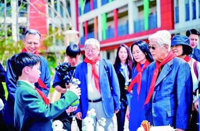 4月10日,中國(guó)科技館原館長(zhǎng)王渝生(中)在重慶明遠(yuǎn)未來(lái)小學(xué)參加科普活動(dòng)。光明圖片