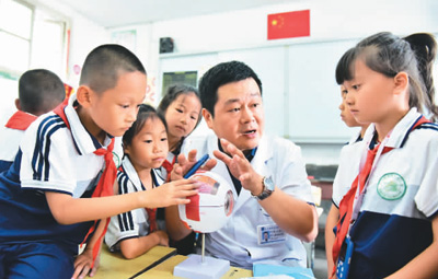 近日,在貴州省黔東南苗族侗族自治州從江縣城關(guān)第三小學(xué),眼科醫(yī)生給學(xué)生講解健康用眼知識(shí)。(石宏輝 攝 人民視覺)