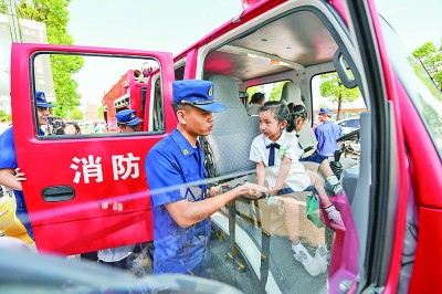 最近,各地學(xué)校陸續(xù)開(kāi)啟新學(xué)期。圖為8月31日,在四川省眉山市彭山區(qū)學(xué)院路幼兒園,眉山市彭山區(qū)消防救援大隊(duì)的消防員為小朋友們介紹消防車(chē)上的裝備。新華社記者 王曦?cái)z