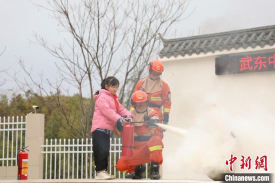 圖為消防員為師生講解手提式干粉滅火器的使用原理,并設(shè)置“火災(zāi)”場(chǎng)景,組織師生實(shí)操體驗(yàn)。 王治康 攝