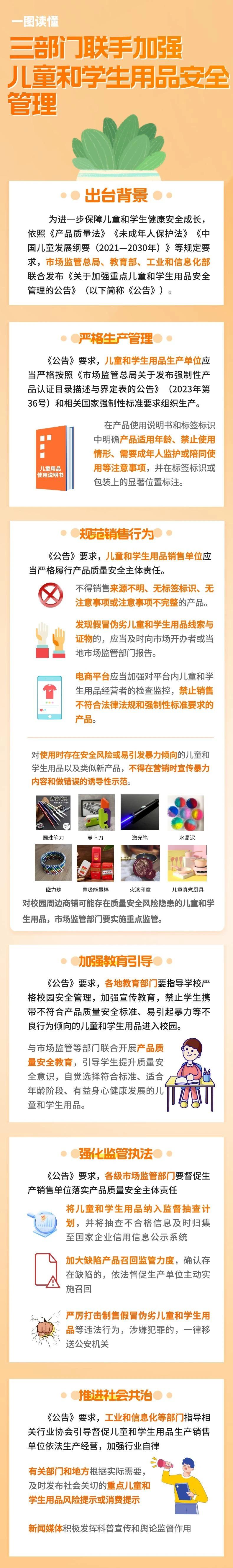 近日 市場監(jiān)管總局、教育部和 工業(yè)和信息化部 就加強(qiáng)重點(diǎn)兒童和學(xué)生用品 安全管理有關(guān)事項(xiàng)發(fā)布公告 禁止學(xué)生攜帶 不符合產(chǎn)品質(zhì)量安全標(biāo)準(zhǔn) 易引起暴力等不良行為傾向的 兒童和學(xué)生用品進(jìn)入校園