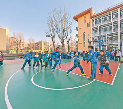 新學(xué)期開學(xué),北京、合肥、上海、深圳等地的多所中小學(xué)將每天一節(jié)體育課設(shè)為標(biāo)配,并將課間從10分鐘延長至15分鐘。在安徽省合肥市青年路小學(xué)的一堂體育課上,學(xué)生們正進(jìn)行跳繩比賽。幾輪比拼后,孩子們臉蛋紅撲撲的,額頭冒汗,成績一次比一次好。