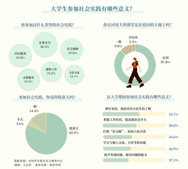 調(diào)查顯示,87.8%的受訪大學(xué)生認(rèn)同,更大的課堂在祖國的大地上。對于參加社會實(shí)踐的意義,受訪大學(xué)生把增長見識,加深對社會民生的了解排在首位,獲選率為53.7%,積累工作經(jīng)驗(yàn),提高就業(yè)競爭力(50.0%),打破“社交圈”,拓展人際關(guān)系(43.6%)分別排在第二、三位。