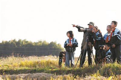 圖為在位于安徽省池州市的十八索省級自然保護區(qū),茅坦小學(xué)的學(xué)生在野生鳥類保護志愿者的帶領(lǐng)下用相機記錄鳥類。