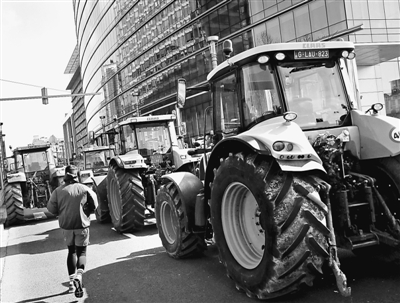 歐盟與俄羅斯之間的相互制裁導(dǎo)致歐盟成員國農(nóng)產(chǎn)品價格下跌,引發(fā)農(nóng)民不滿。圖為今年3月,比利時農(nóng)民將拖拉機(jī)開上布魯塞爾的街道,進(jìn)行抗議示威。人民視覺