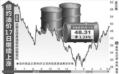 近期,國際原油價格屢現(xiàn)攀升,逼近每桶50美元。5月17日,截至當(dāng)日收盤,紐約商品交易所6月交貨的輕質(zhì)原油期貨價格上漲0.59美元,收于每桶48.31美元,漲幅為1.24%。7月交貨的倫敦布倫特原油期貨價格上漲0.31美元,收于每桶49.28美元,漲幅為0.63%。分析認(rèn)為,一些突發(fā)因素導(dǎo)致了近期油價攀升,國際油市實現(xiàn)供需平衡仍需時日。