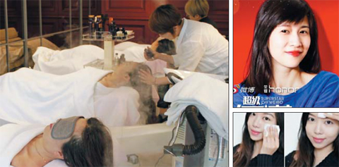 今年3月,在首爾新沙洞林蔭道,中國(guó)“網(wǎng)紅”們正在接受愛(ài)茉莉太平洋用韓方洗發(fā)水產(chǎn)品進(jìn)行的頭皮護(hù)理。右上方的圖片,是papi醬上月16日在上海進(jìn)行的粉絲見(jiàn)面會(huì)海報(bào)。下方的圖片是“網(wǎng)紅”周倩晗今年3月在自己微博上發(fā)布的韓國(guó)化妝品體驗(yàn)后記。