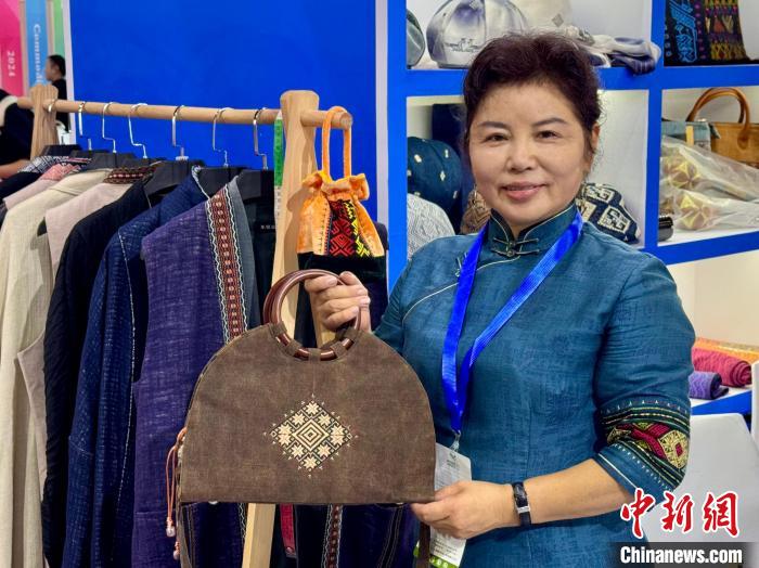 10月13日,來自海南的琴韻幽蘭品牌設計師王彬妮展示黎錦元素面料制成的產(chǎn)品。董易鑫 攝