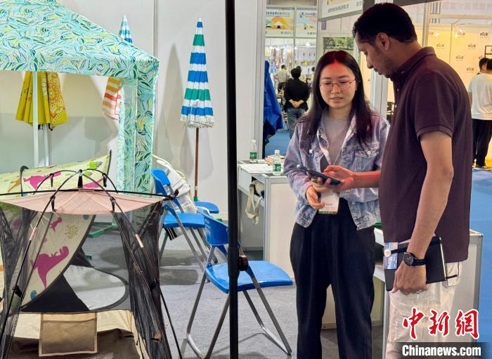 10月13日,一位外商(右一)在中國義烏文化和旅行產(chǎn)品交易博覽會了解戶外產(chǎn)品。董易鑫 攝