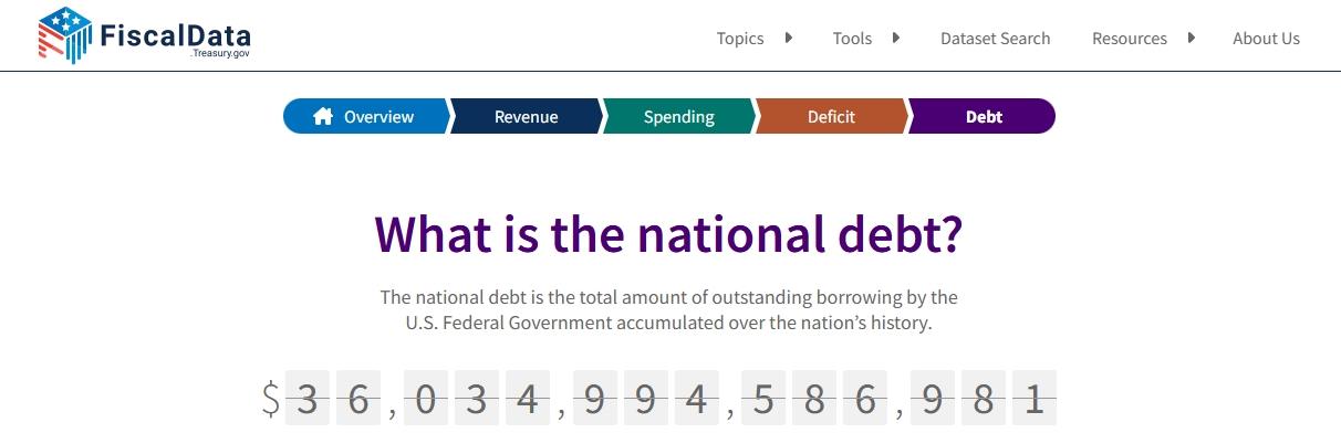 △美國財政部下屬的財務(wù)數(shù)據(jù)網(wǎng)站當(dāng)前數(shù)據(jù)顯示,美國聯(lián)邦政府債務(wù)總額已達(dá)到36.034萬億美元。