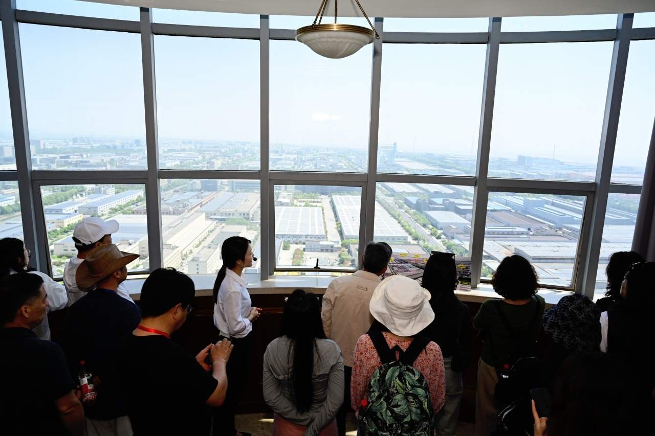 通過城市綠色觀景臺,采訪團成員們得以在空中觀景平臺俯瞰尖山全景,光伏發(fā)電板在陽光的照耀下熠熠生輝;不遠(yuǎn)處,風(fēng)力發(fā)電機的巨大葉片也在悠悠轉(zhuǎn)動。這一光伏發(fā)電與風(fēng)力發(fā)電協(xié)同運作的景象被毫無保留地盡收眼底。