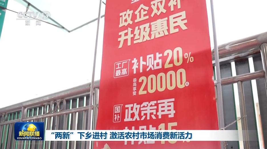 央視網(wǎng)消息(新聞聯(lián)播):“兩新”政策實施以來,各地通過擴大補貼范圍、優(yōu)化服務等措施,將實惠和便利送到鄉(xiāng)村,激發(fā)農(nóng)村市場消費活力。
