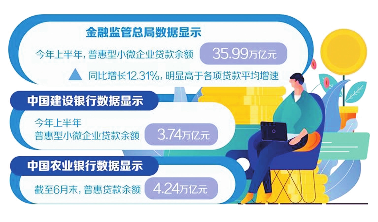 小微企業(yè)是經(jīng)濟(jì)發(fā)展的生力軍、就業(yè)的主渠道、改善民生的重要支撐。金融監(jiān)管總局統(tǒng)計數(shù)據(jù)顯示,上半年,普惠型小微企業(yè)貸款增長較快,普惠型小微企業(yè)貸款余額35.99萬億元,同比增長12.31%,明顯高于各項貸款平均增速。