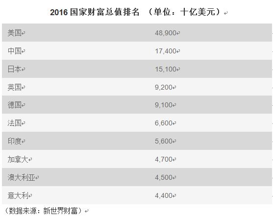 美國以48.9萬億美元(約合人民幣327萬億元)財(cái)富總值高居榜首,接下來依次是中國、日本、英國、德國、法國、印度、加拿大、澳大利亞和意大利。