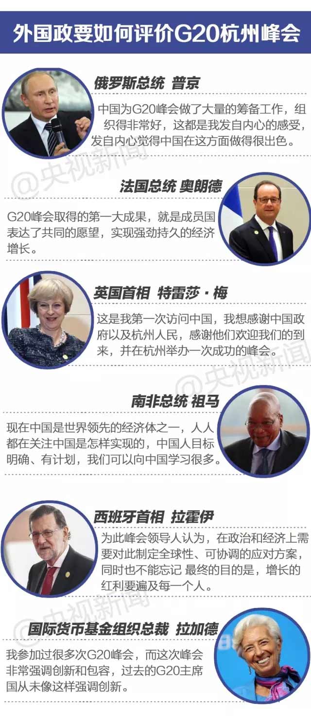 各方高度贊揚(yáng)杭州峰會(huì)的共識(shí),感謝中國(guó)舉辦會(huì)議的付出。一些與會(huì)領(lǐng)導(dǎo)人還肯定了中國(guó)的發(fā)展成就以及中國(guó)經(jīng)濟(jì)發(fā)展對(duì)全球經(jīng)濟(jì)的影響,明確表示愿與中國(guó)加強(qiáng)合作的意愿。杭州峰會(huì)使G20進(jìn)入升級(jí)版,使中國(guó)成為G20中舉足輕重的角色。