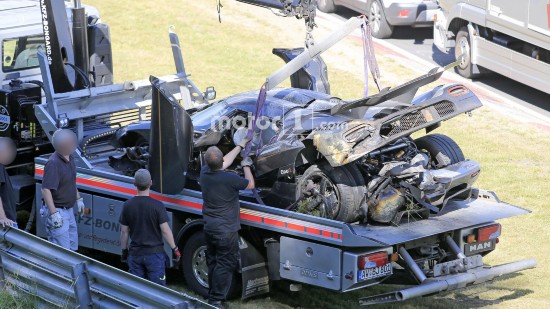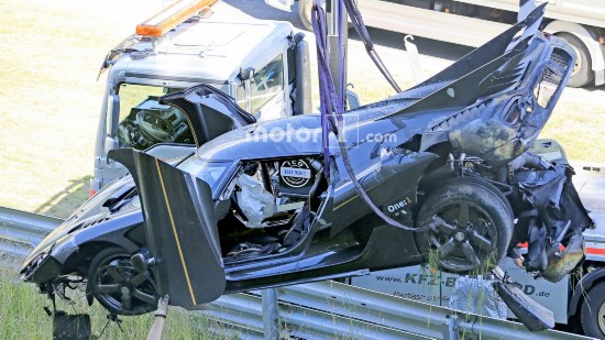 科尼塞克早上發(fā)布消息稱One:1打算在紐北刷新最快圈速紀錄。知情人表示,刷圈過程中,車輛在高速駛?cè)階denauer Forst彎時發(fā)生失控,車身撞跨賽道左側(cè)的護欄,進而飛入草地,事故令One:1車身損毀嚴重,前保險杠折斷、擋風(fēng)玻璃破碎,尾部受損。