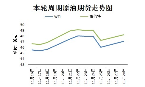 本輪計(jì)價(jià)周期內(nèi),國(guó)際原油價(jià)格呈現(xiàn)先漲后跌再漲態(tài)勢(shì)。截至11月28日收盤,當(dāng)日,美國(guó)WTI原油期貨漲1.02美元,報(bào)收47.08美元/桶;布倫特原油期貨漲1.00美元,報(bào)收48.24美元/桶。